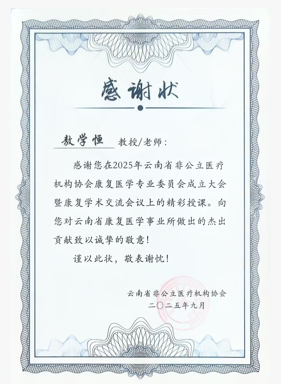 2025年9月27日,云南省非公立医疗机构协会主办的"云南省非公立医疗机构协会康复医学专业委员会成立大会暨重症康复医学学术会议"在昆明同仁医院圆满落幕。昆明滇池康悦医院当选云南省非公医疗机构协会康复医学专委会第一届副主任委员单位,康复中心敖学恒院长当选康复医学专业委员会副主任委员,陈四亮、徐俊、常苏平等当选委员。
